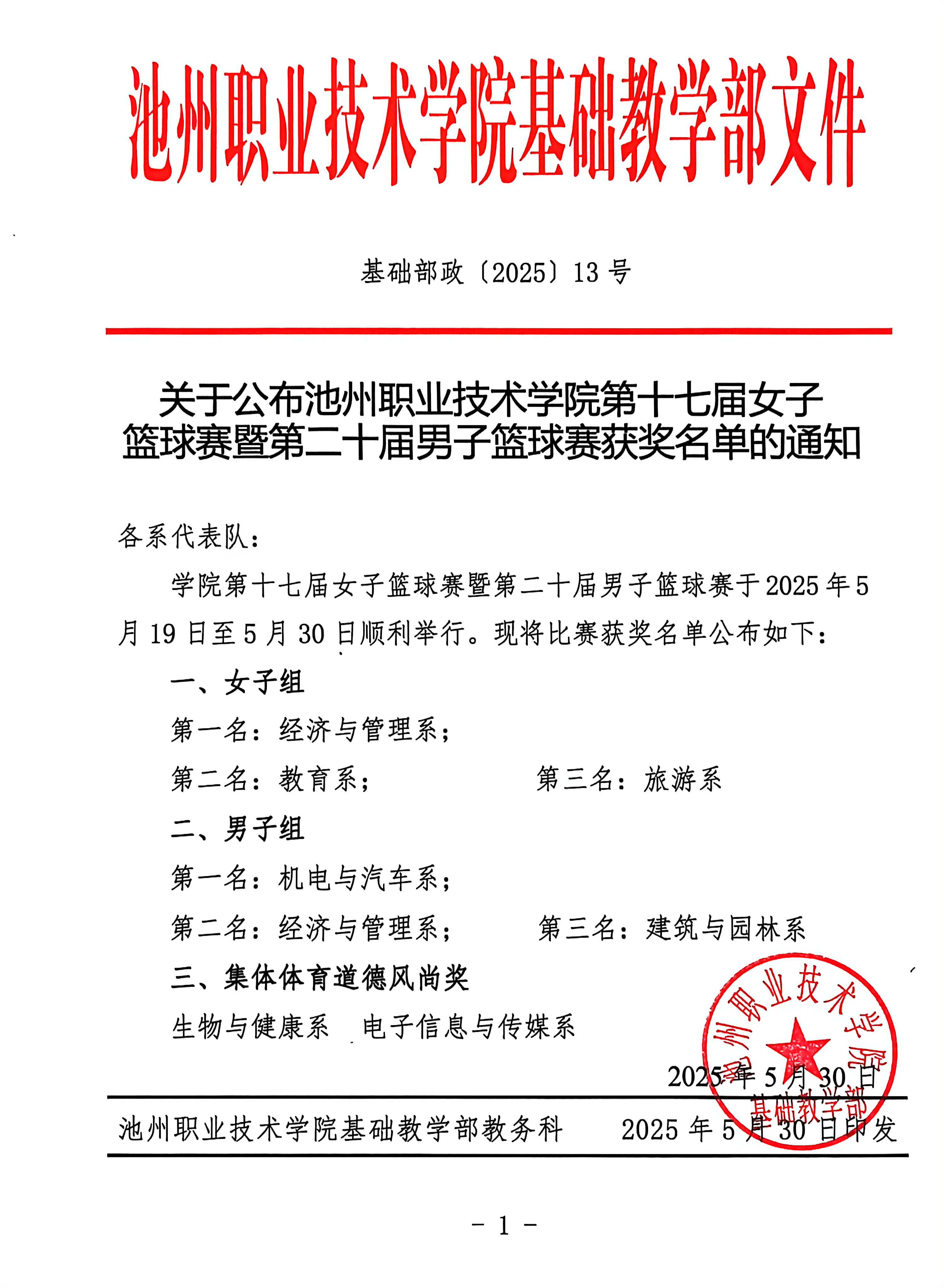 关于公布池州职业技术学院第十七届女子篮球赛暨第二十届男子篮球赛获奖名单的通知