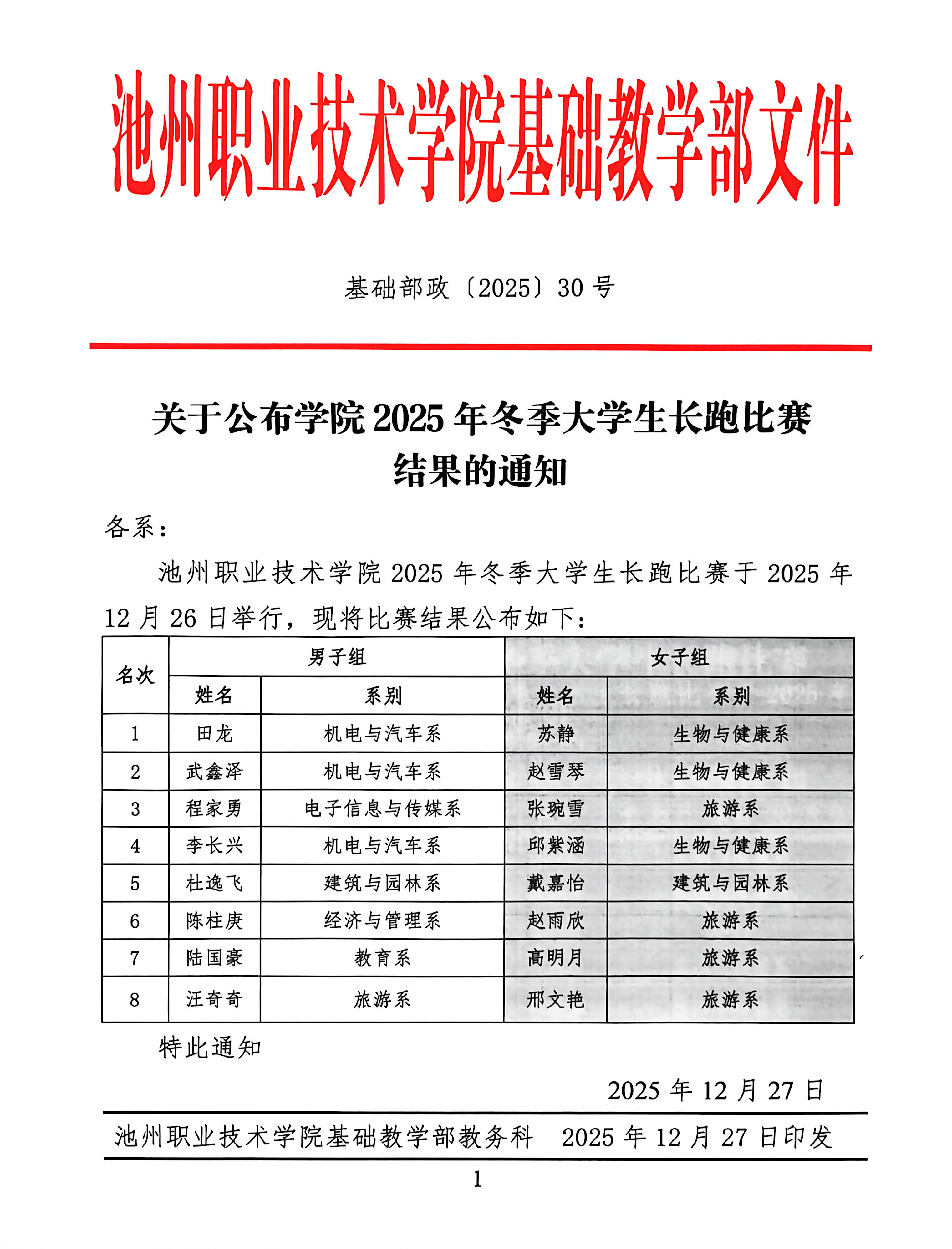 关于公布学院2025年冬季大学生长跑比赛结果的通知